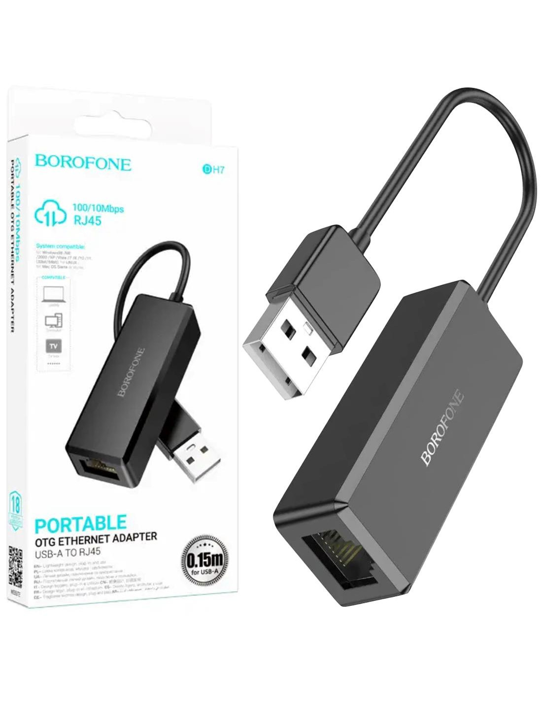 Borofone DH7 Cable de RED Ethernet tipo OTGEl cable de RED Ethernet tipo OTG Borofone DH7 es la solución perfecta para aquellos que desean una conexión rápida y confiable a internet en sus dispositivos USB tipo A.Características principales:Velocidad de la Red: 10 / 100 MbpsEntrada del conector: USB tipo ASalida del conector de la RED: tipo RJ45Con una velocidad de red de 10/100 Mbps, este cable garantiza una conexión estable y de alta velocidad para transferir datos y acceder a internet sin problemas.El conector USB tipo A asegura una conexión fácil y compatible con una amplia gama de dispositivos, como computadoras portátiles, computadoras de escritorio, tablets y más.El conector de la RED tipo RJ45 garantiza una conexión segura y estable, evitando interrupciones en la señal y proporcionando una transferencia de datos fluida.Ya sea que necesites una conexión a internet para trabajar, jugar o simplemente navegar por la web, el cable de RED Ethernet tipo OTG Borofone DH7 es la elección perfecta para obtener una conexión rápida y confiable en tus dispositivos USB tipo A.Consigue una conexión rápida y confiable en tus dispositivos USB tipo A con el cable de RED Ethernet tipo OTG Borofone DH7, ¡stock disponible en las Islas Canarias!