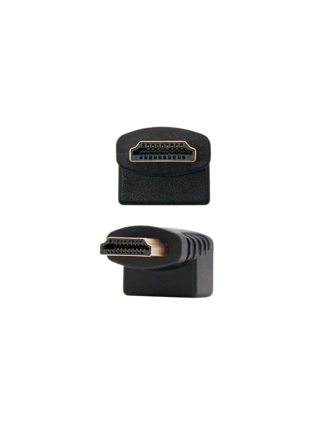 - Adaptador HDMI acodado con conector HDMI tipo A macho en un extremo y HDMI tipo A hembra en el otro