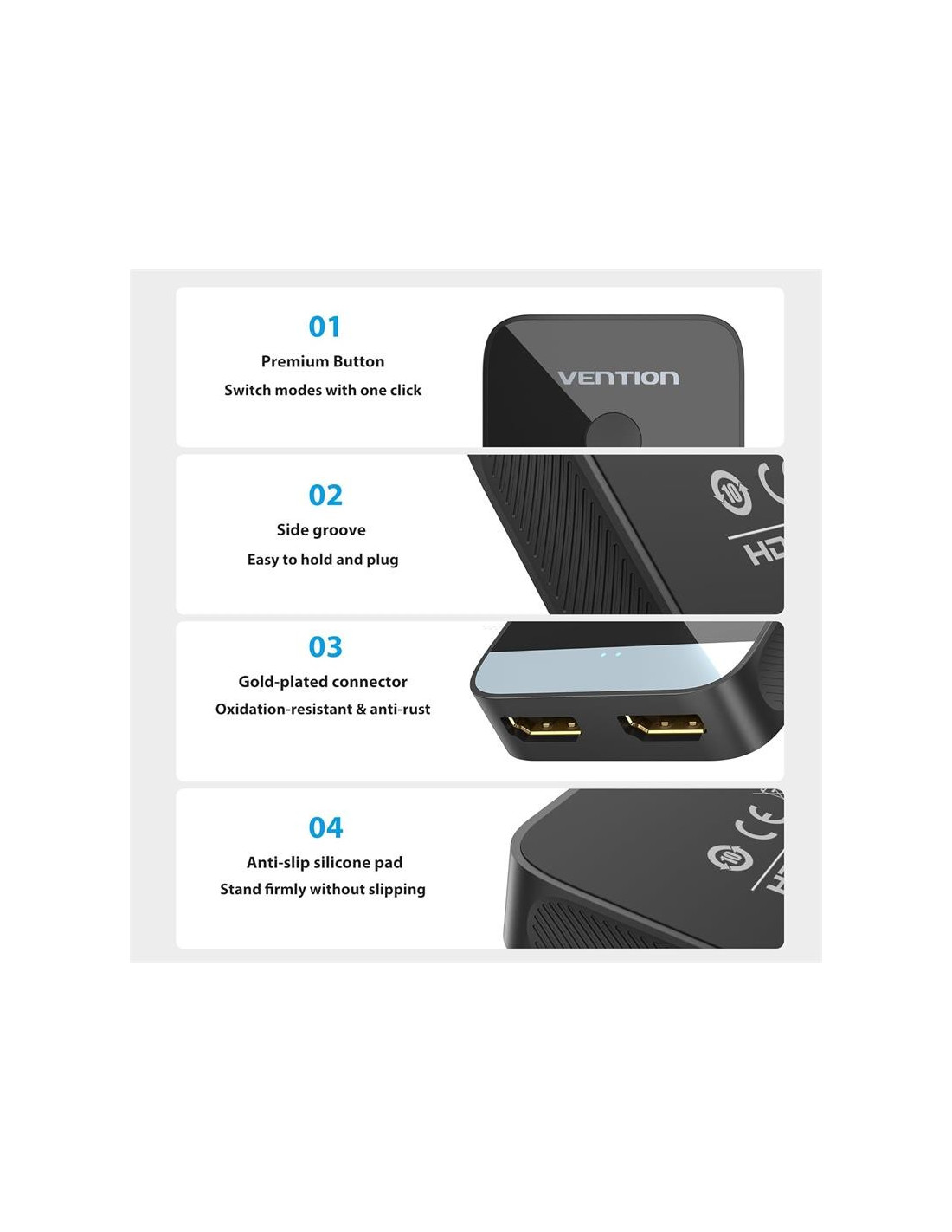 Sin embargo, tambi?n puede usar este interruptor Vention en la direcci?n opuesta, es decir, conectar dos monitores a una fuente. El Switch admite resoluciones de hasta 4K para una experiencia de imagen perfecta. Puede averiguar qu? puerto est? actualmente activo gracias a los indicadores LED, de un vistazo.Dimensiones compactas