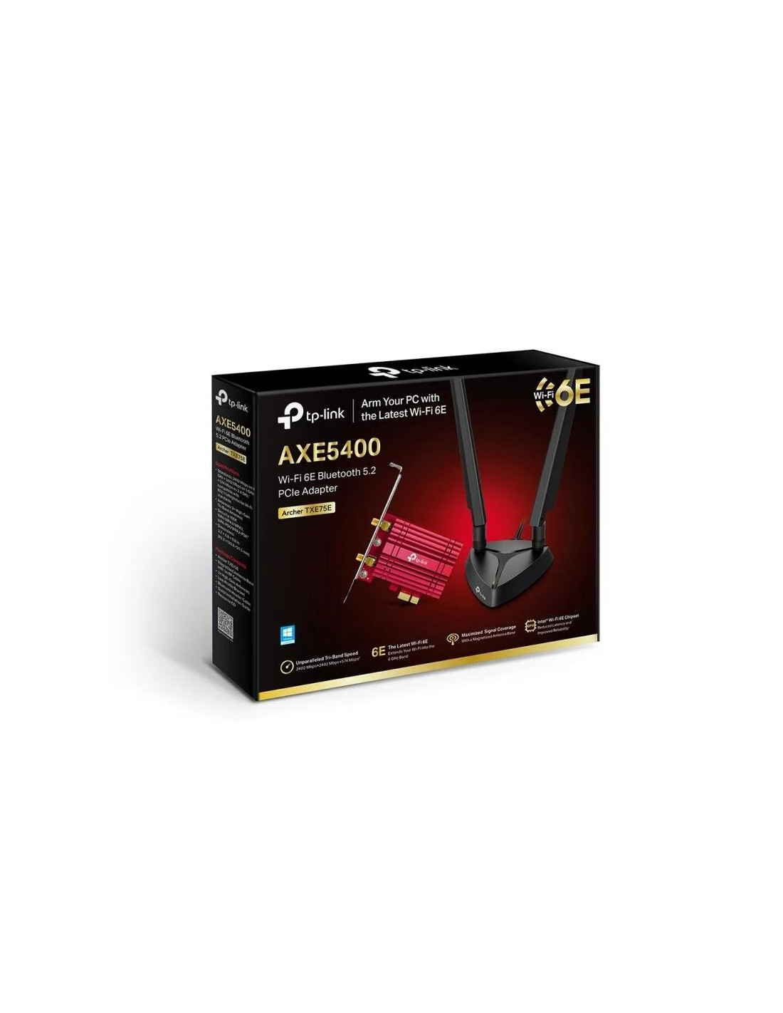 Conecta tu PC a la nueva frontera con el adaptador TP-Link Archer TXE75E PCIe AXE5400 con Wi-Fi 6E y Bluetooth 5.2. WiFi 6E significa WiFi 6 extendido a la banda de 6 GHz, una banda de frecuencia recientemente abierta que agrega m?s ancho de banda, velocidades m?s r?pidas y menor latencia. Esto abre recursos para futuras innovaciones en AR/VR, transmisi?n de 8K y m?s.