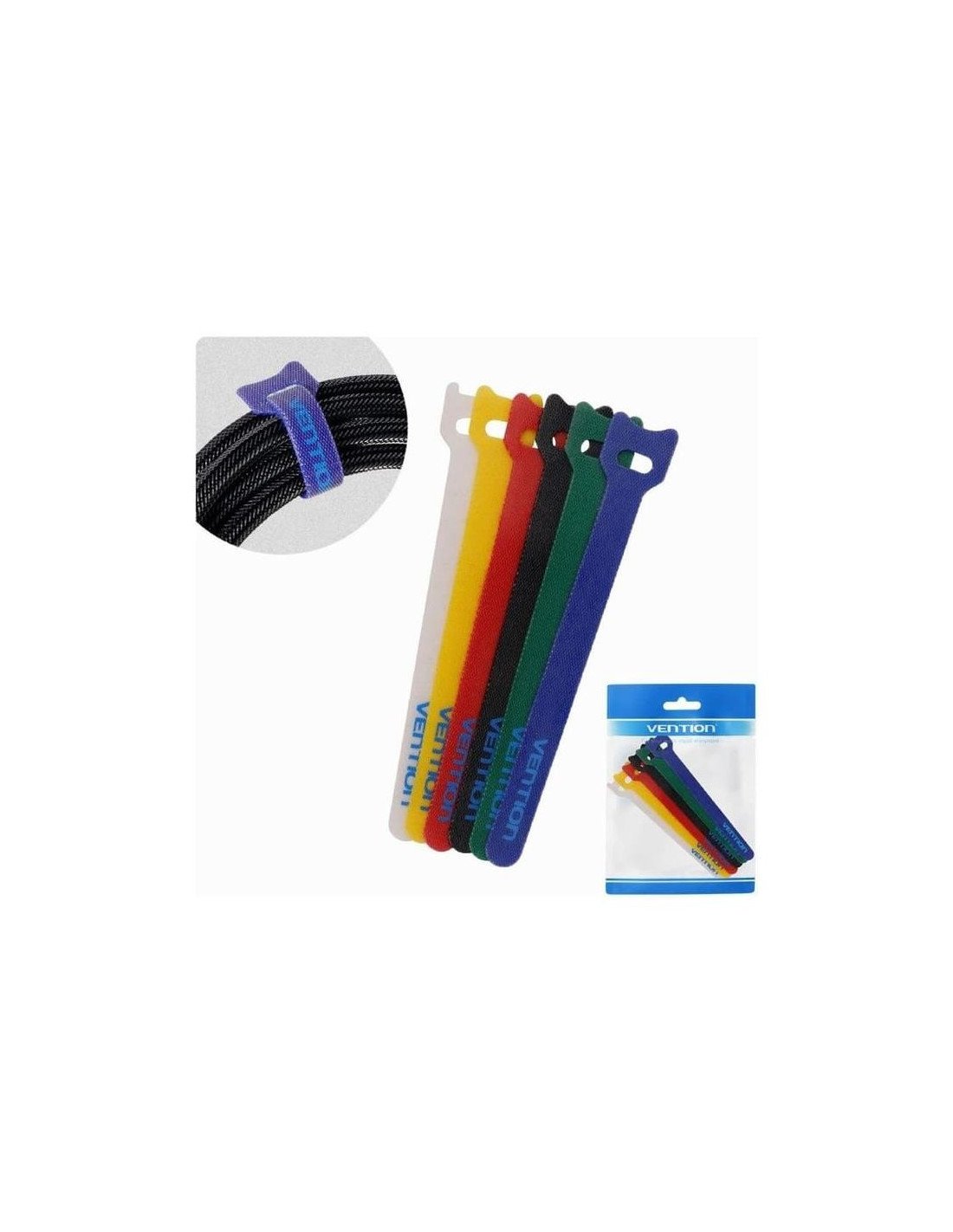 Set de 6 tiras organizadoras de cables Vention KAC00, reutilizables, de colores surtidos y con ajuste seguro para mantener el espacio ordenado y libre de enredos.