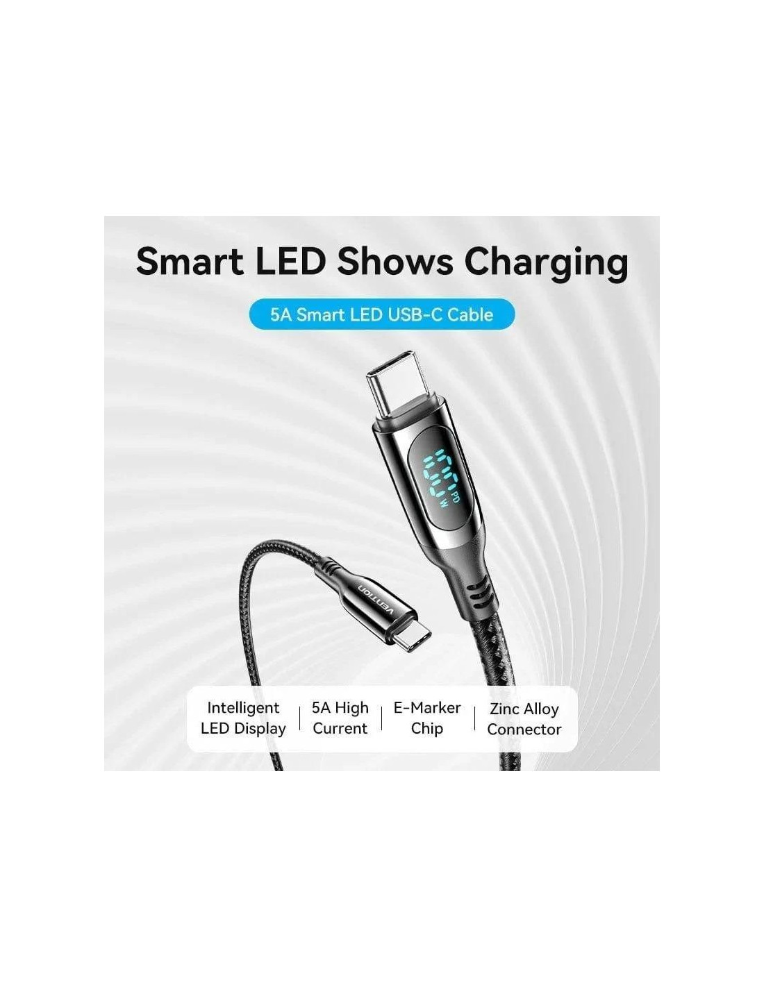 Cable USB-C a USB-C 2.0 (1.2?m, 5A) con trenzado de algod?n, aleaci?n de zinc y pantalla LED: carga r?pida, estilo y funcionalidad en un solo cable.