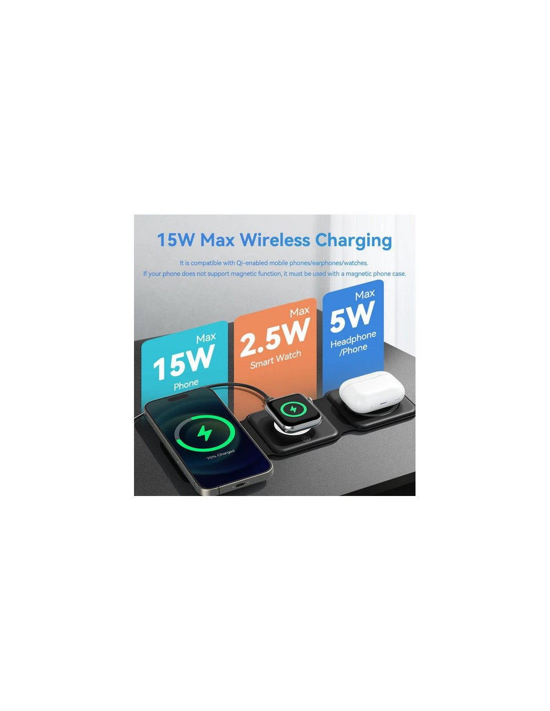 Potencia de carga ?ptima: Ofrece salida de 15W para el iPhone, 2.5W para el Apple Watch y 3W para los AirPods.