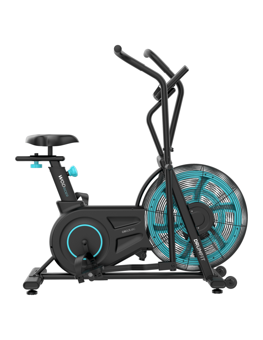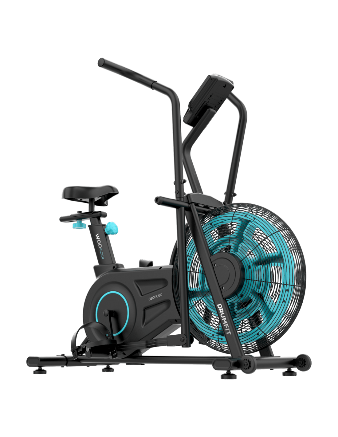 Drumfit WOD Rider 2000 Eolo PRO es una bicicleta de aire para entrenamientos intensivos, con ventilador de 480 mm y resistencia progresiva, pedaleo silencioso por correa, pantalla LCD, medidor de pulso en las asas, ruedas de transporte, compatibilidad y capacidad máxima de 135 kg.