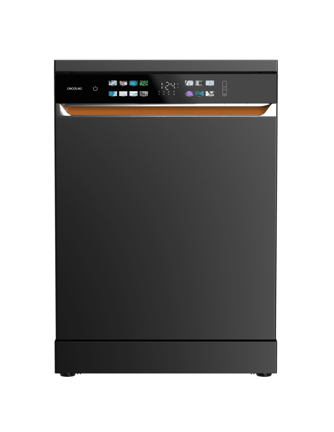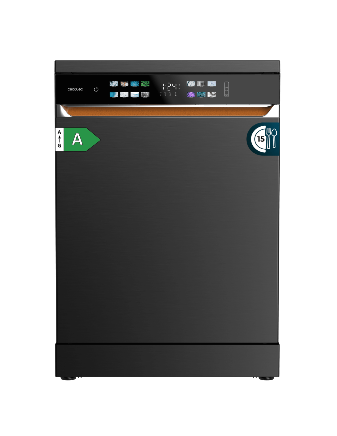 Bolero Aguazero 6900 Dark Lavavajillas dark inox de 15 cubiertos, clase energética A, acabados en imitación cuero, pantalla FullColor XXL, motor Inverter Plus, 8 programas, función UV Hygiene, secados Auto Open y Turbo Dry+, Dual Zone Wash, bandeja ajustable, Half Load, Machine Care, Delay Start, bandeja para cubiertos y ChildLock.
