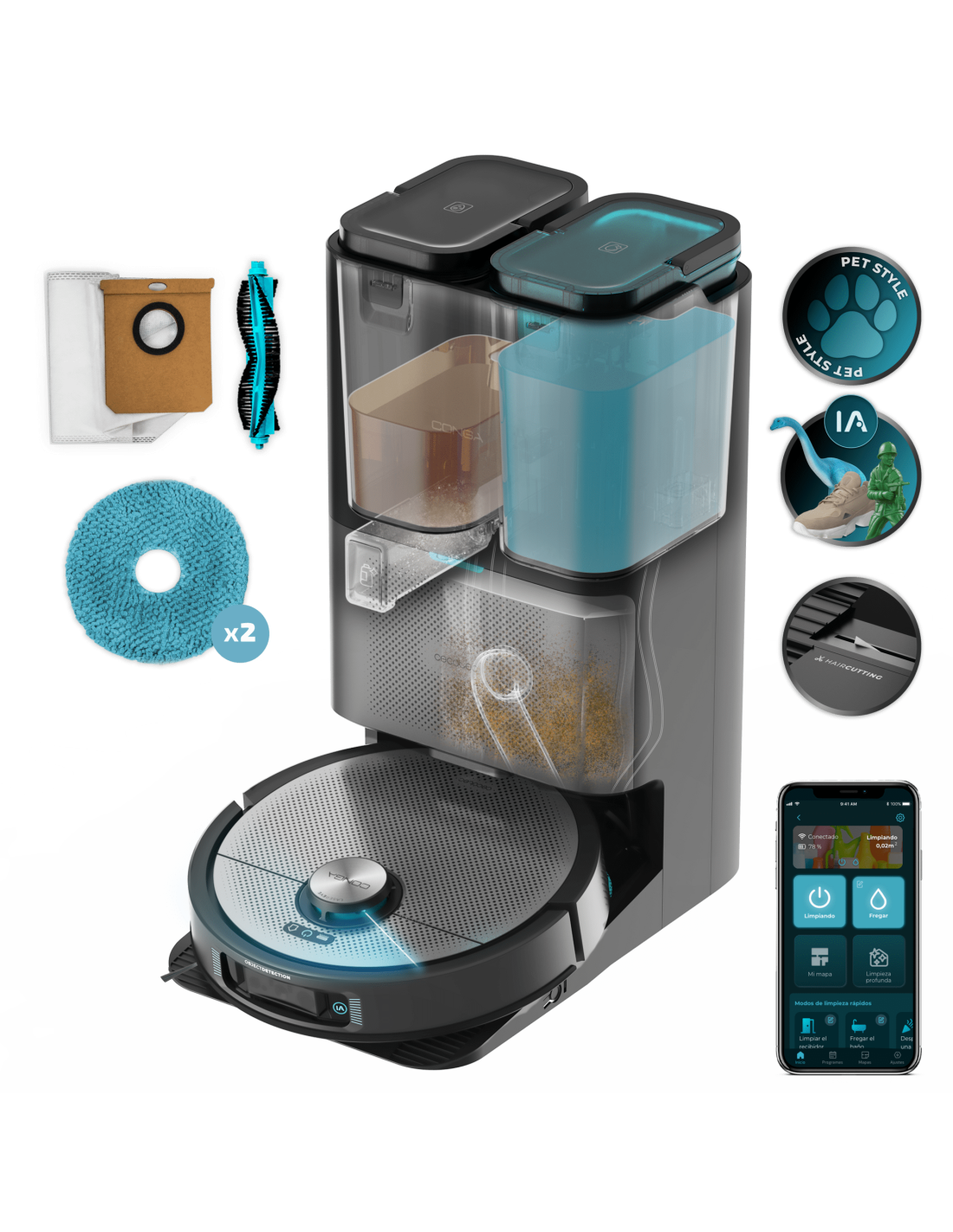 Conga 20090 ProAI InfinitySoap Cut&Spa Robot aspirador con TecnologÃa láser de navegación y detección de objetos. Base de autovaciado con tanques de agua limpia y agua sucia, bolsa de polvo y dosificador de jabón. Autolimpieza y secado de mopas. Mopas giratorias, elevables y extensibles. 8000 Pa de presión de succión. Control APP y asistentes virtuales. Sistema Hair Cutting en la base de autovaciado para eliminar los pelos del cepillo.