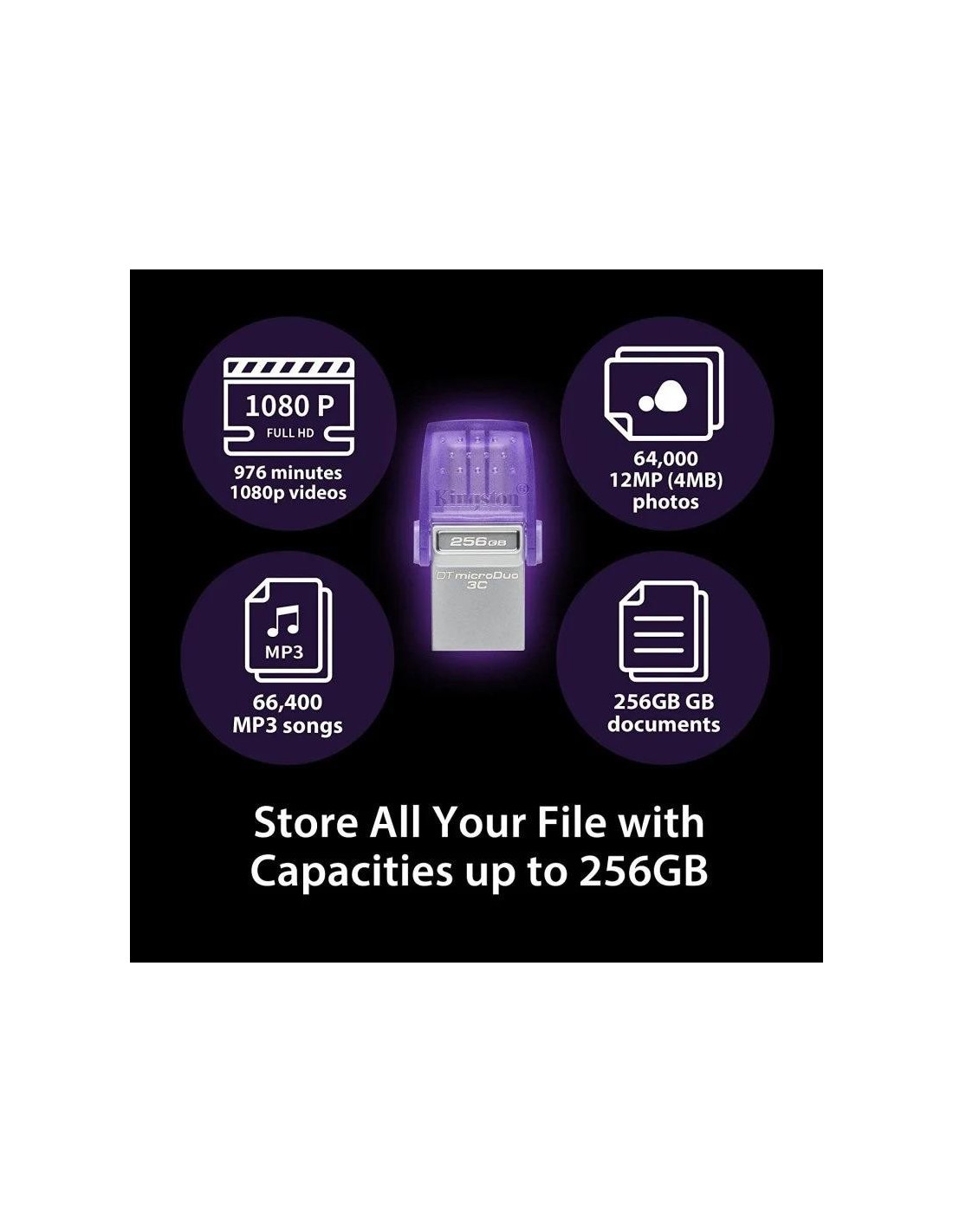 DataTraveler? microDuo? 3C tiene una doble interfaz que funciona con los nuevos USB Type-C? y los puertos USB Type-A tradicionales. Es una forma ideal de liberar espacio en tu smartphone o tableta con hasta 256 GB de almacenamiento adicional para fotos y v?deos. El atractivo formato ofrece una c?moda conectividad plug and play. Transfiere r?pidamente archivos entre tus dispositivos a una velocidad de hasta 200 MB/s de lectura por el USB 3.2 Gen 1