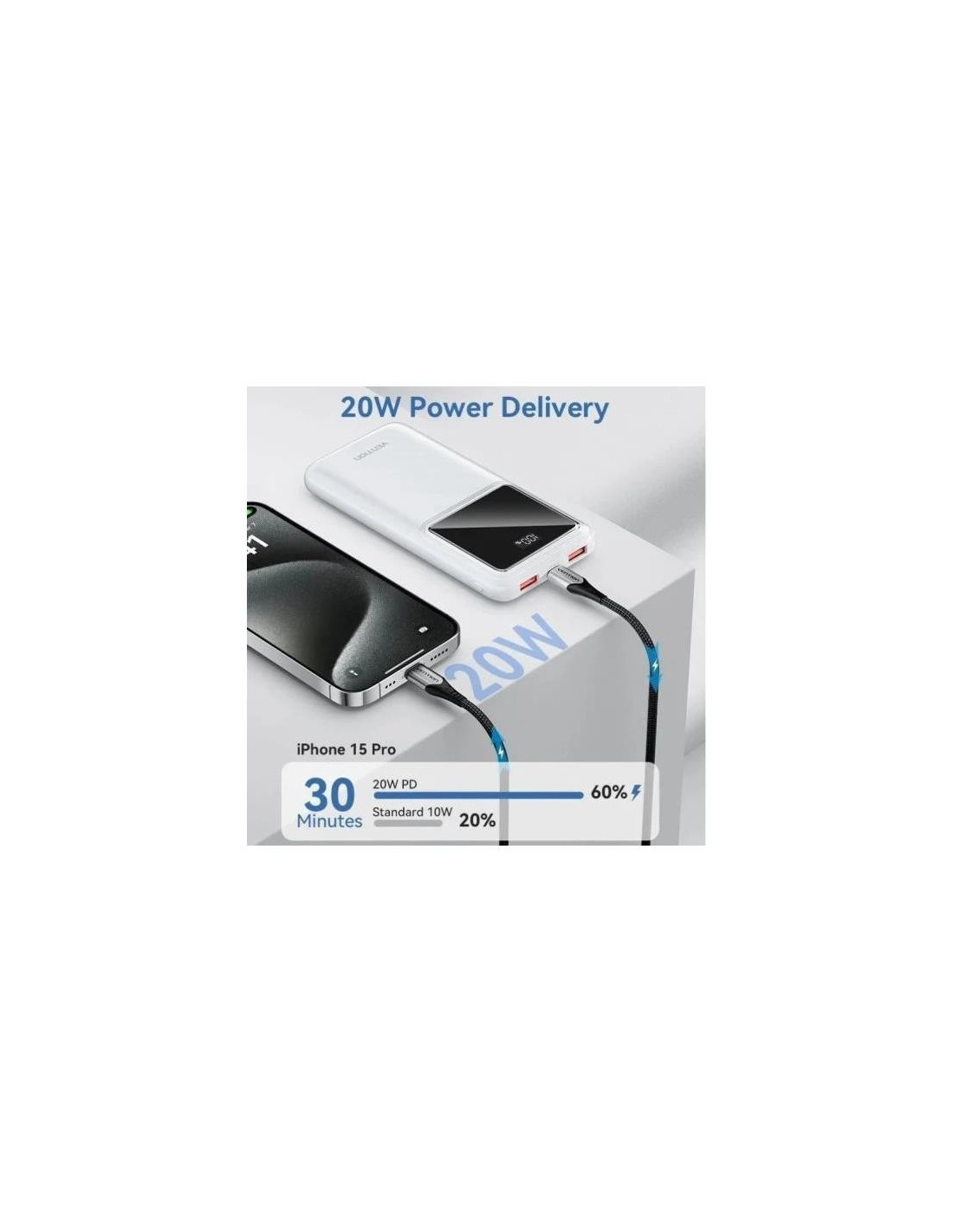 POWERBANK VENTION 10000MAH 2XUSB-A + USB-C LED DISPLAY 22.5W WHITE