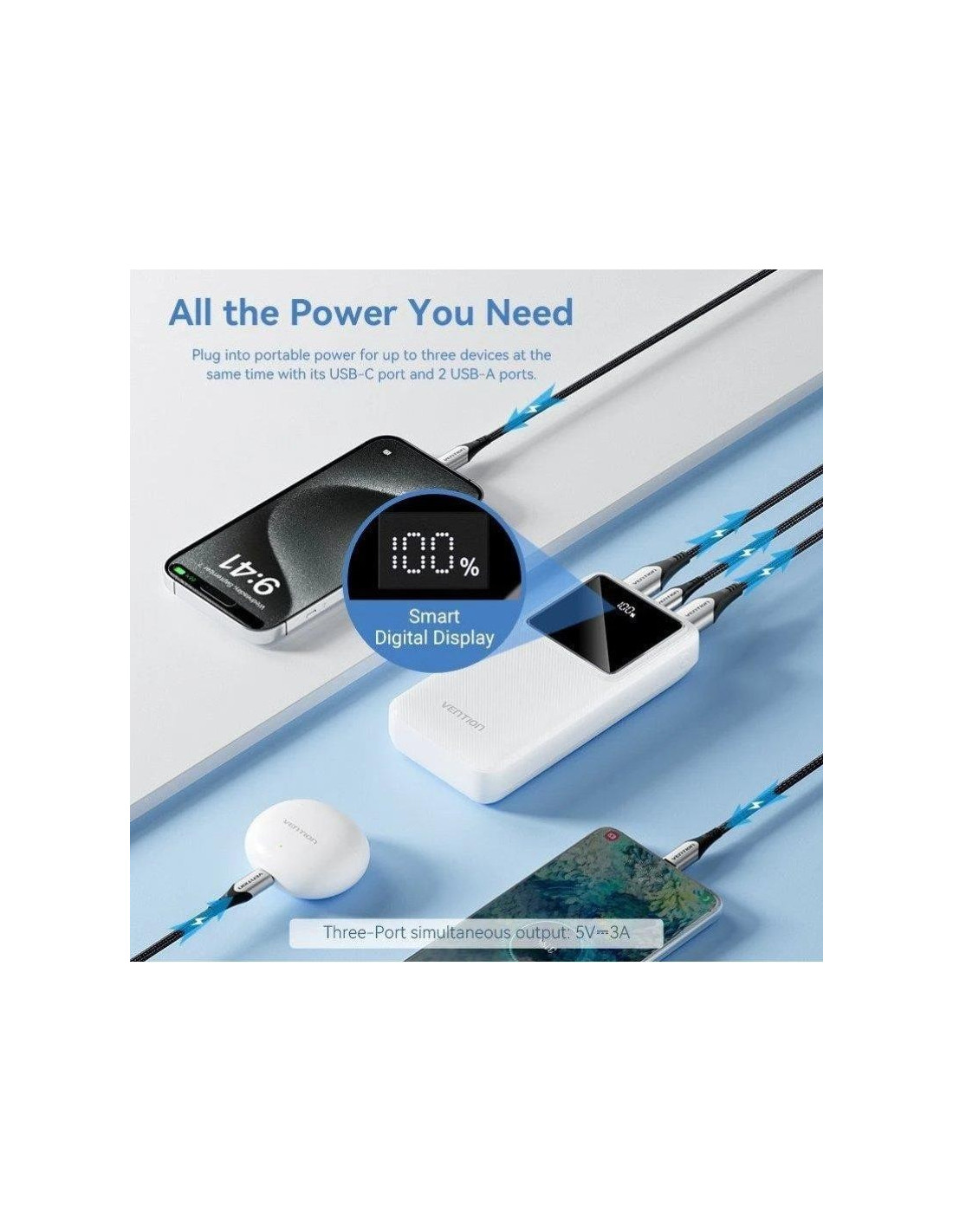 - Powerbank de 3 USB-C que cargan al mismo tiempo y 2 USB-A