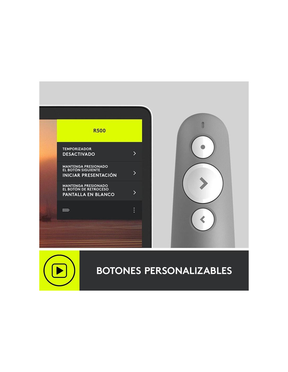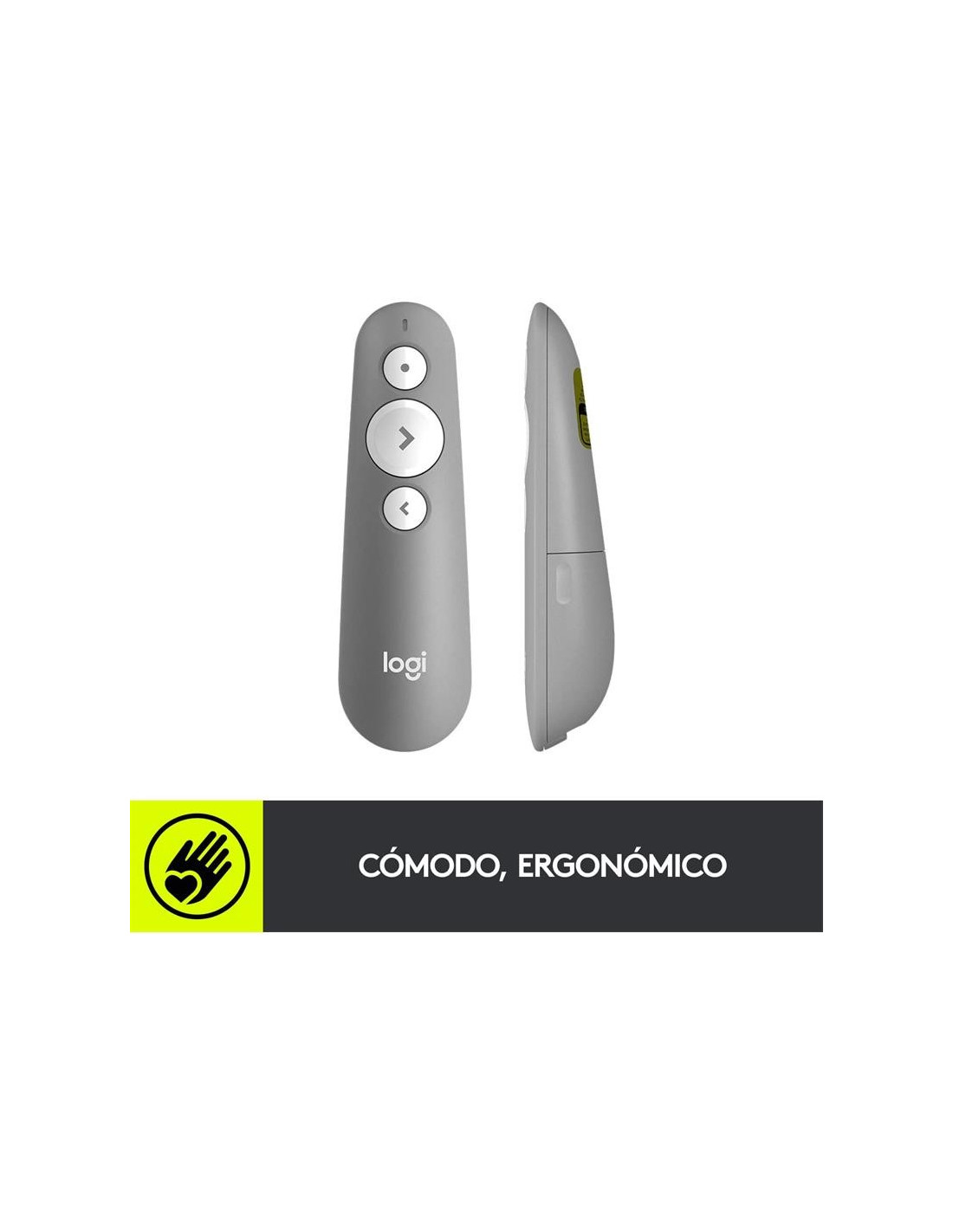 - Dise?ado para una sujeci?n segura: El mando inal?mbrico l?ser para presentaciones R500 se ha dise?ado para adaptarse c?modamente a la palma de la mano, y su superficie de goma blanda y botones texturizados facilitan la sujeci?n al presentar.