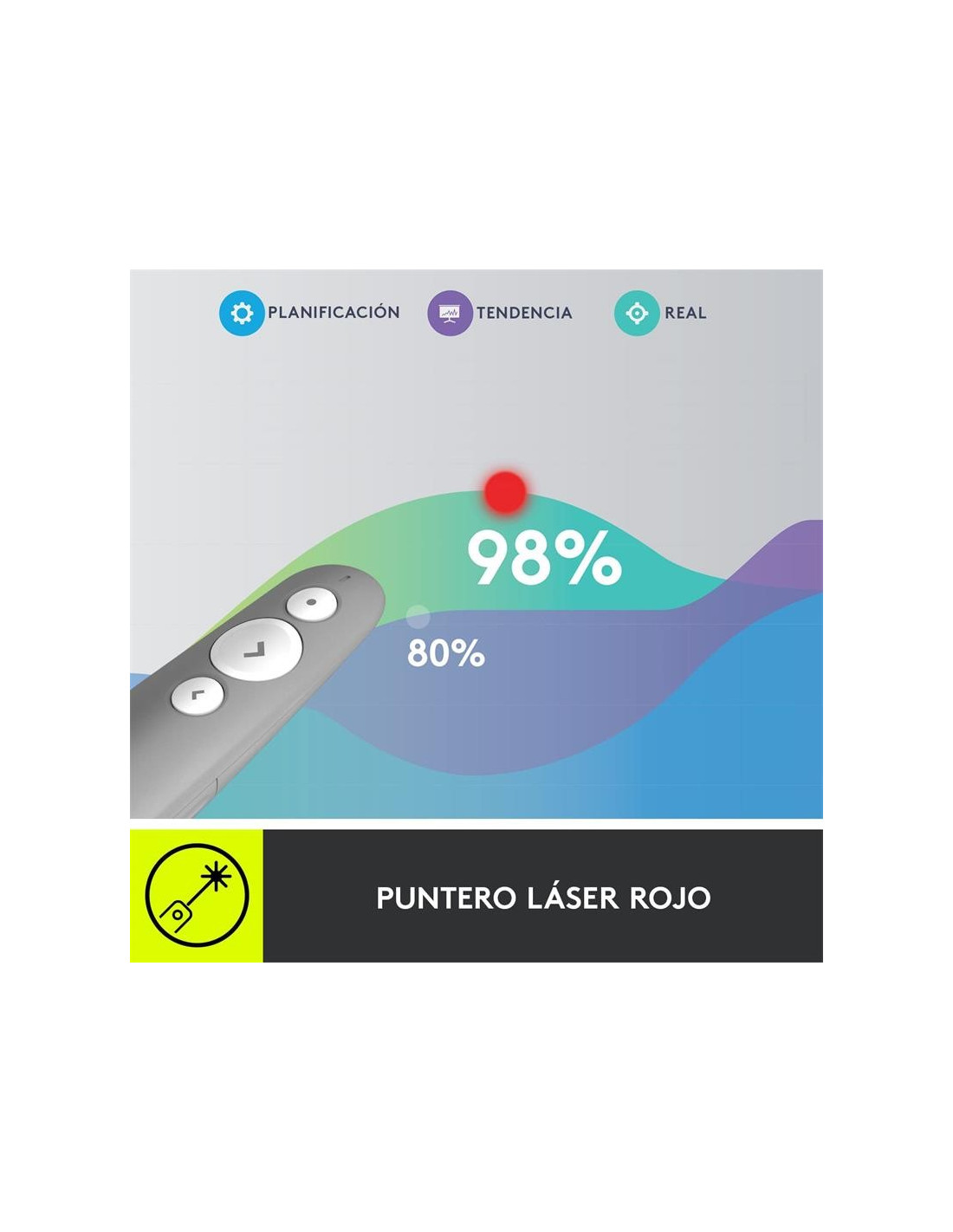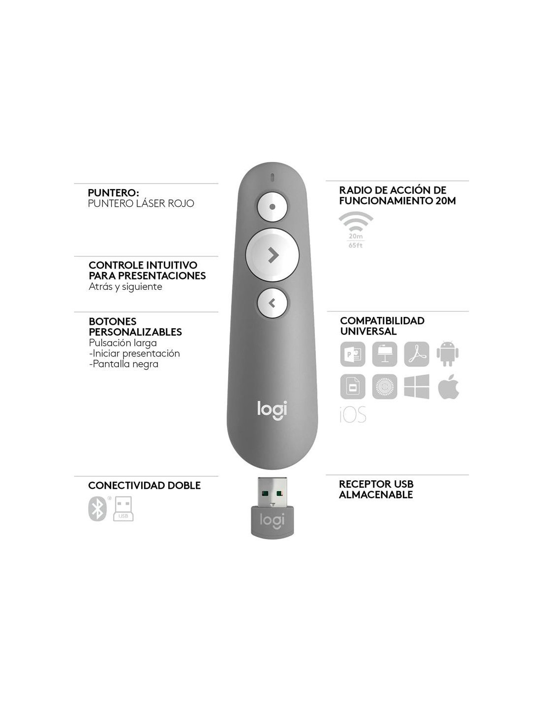 Realice presentaciones impactantes con el mando inal?mbrico l?ser para presentaciones R500. Mu?vase libremente y navegue por las diapositivas a una distancia de hasta 20 metros de la pantalla, y se?ale las ?reas relevantes con el puntero l?ser rojo. El R500 est? optimizado para funcionar con Windows?, macOS y los principales programas de software de presentaci?n.