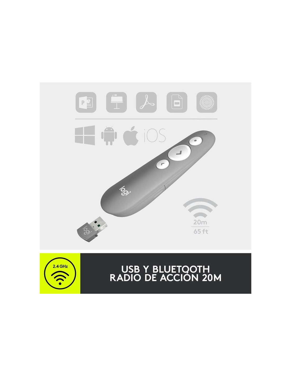 - Radio de acci?n de 20 metros Conecte el R500 al ordenador mediante el receptor USB o tecnolog?a Bluetooth? de bajo consumo. Luego mu?vase y presente con plena libertad a una distancia de hasta 20 metros. *Depende de las condiciones del entorno y de los dispositivos.