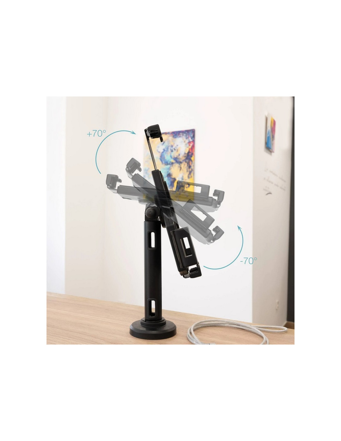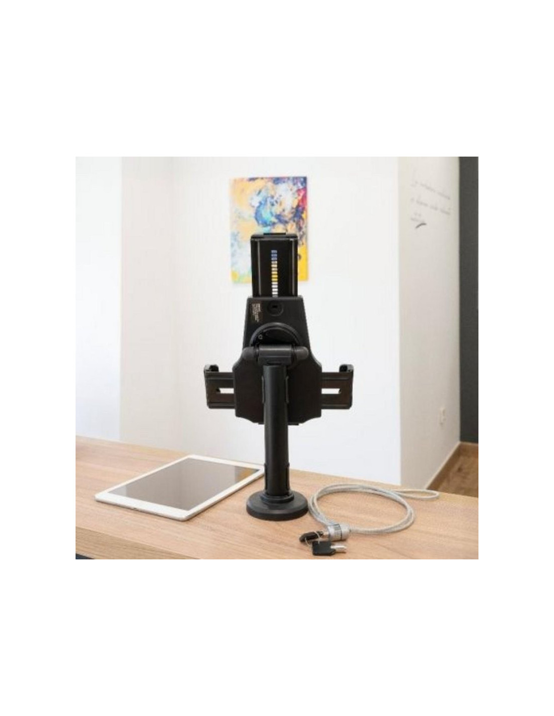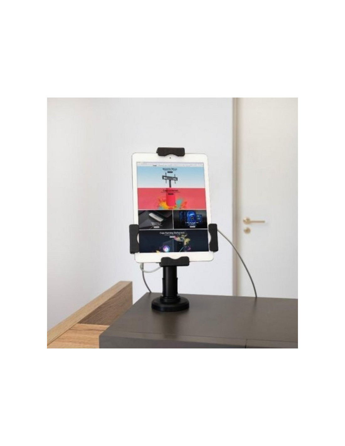 Seguridad profesional para tablets. Este soporte antirrobo de sobremesa o pared está diseñado especialmente para negocios, comercios y espacios públicos que buscan proteger dispositivos sin renunciar a la funcionalidad ni al diseño. Su estructura en acero de alta calidad proporciona robustez y resistencia frente a robos e intentos de manipulación no autorizada.