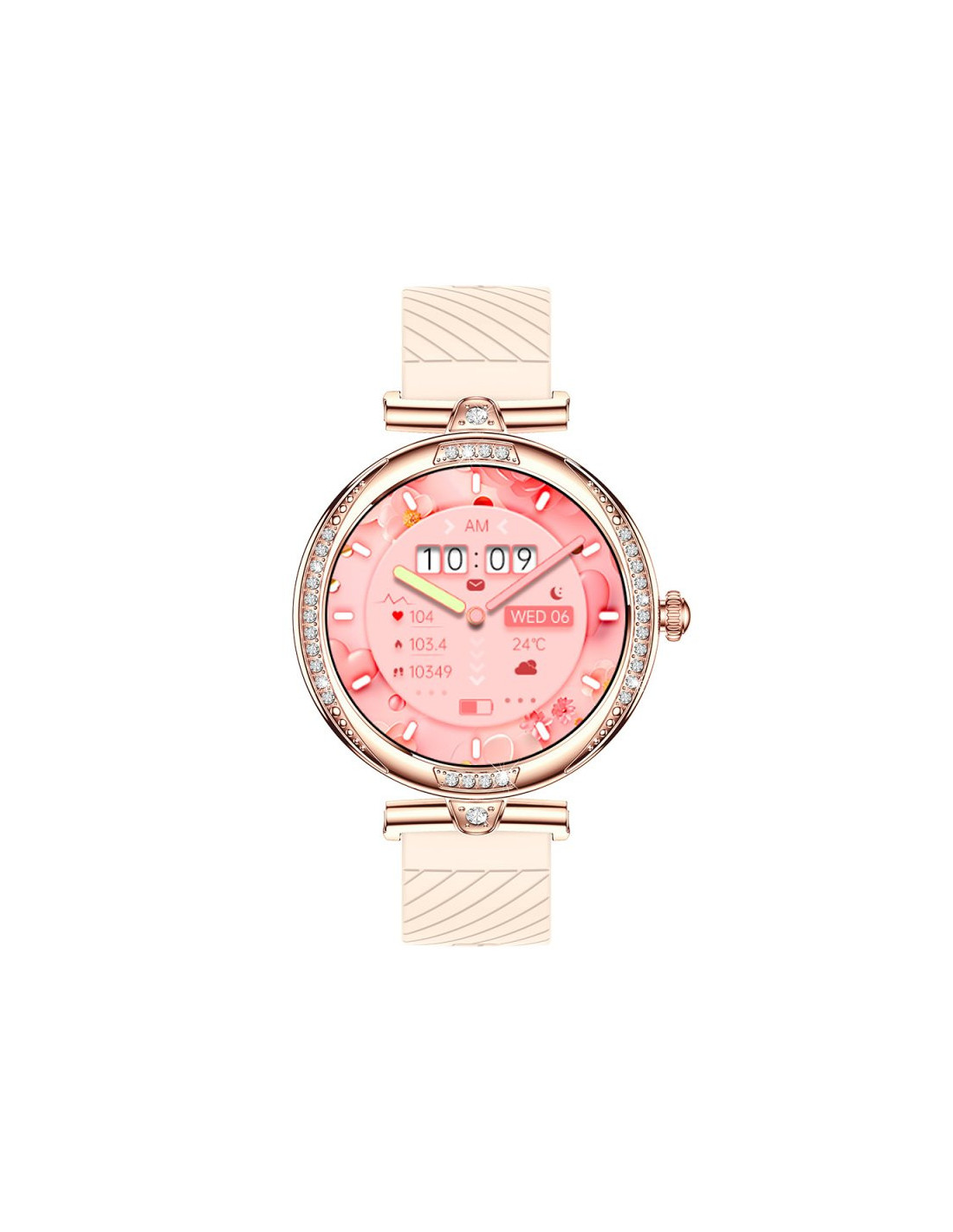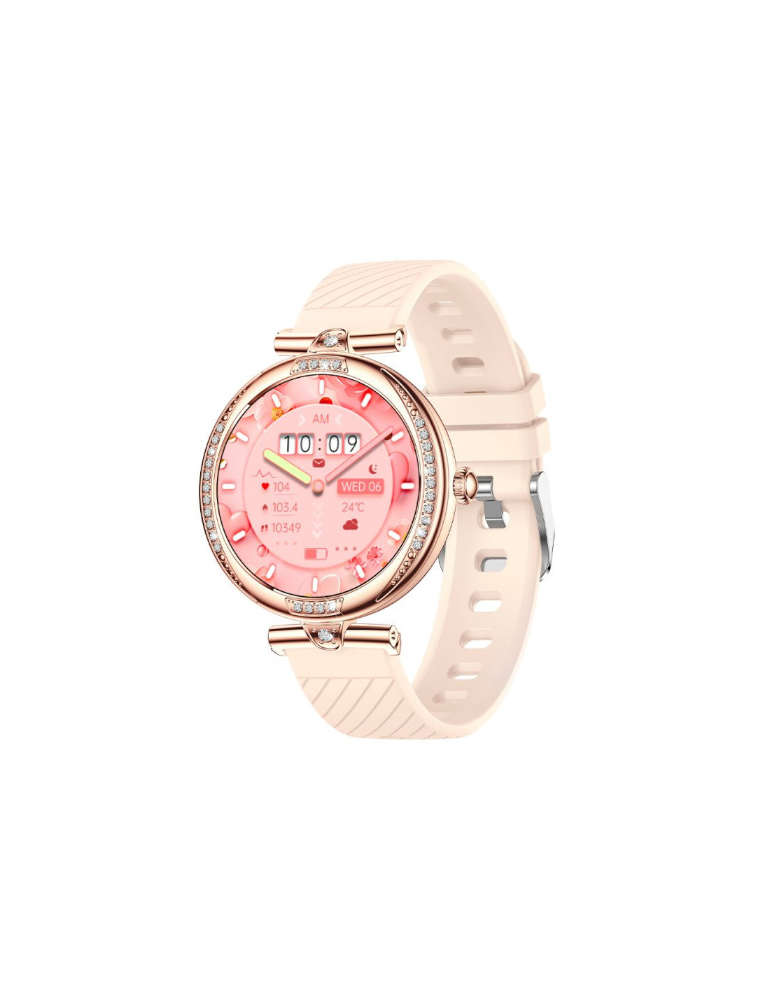 Espectacular diseño premium con cristales incrustados alrededor de la esfera, lo que convierten a este smartwatch en un verdadero capricho exclusivo.